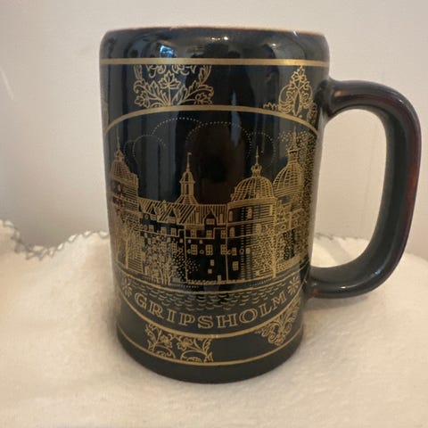 Klassiskt vitt krus med hänklar och blå dekor; ca 8 liter, diameter ca 27 cm, höjd 20 cm. Felfritt, ser oanvänt ut/mycket sparsamt använt.