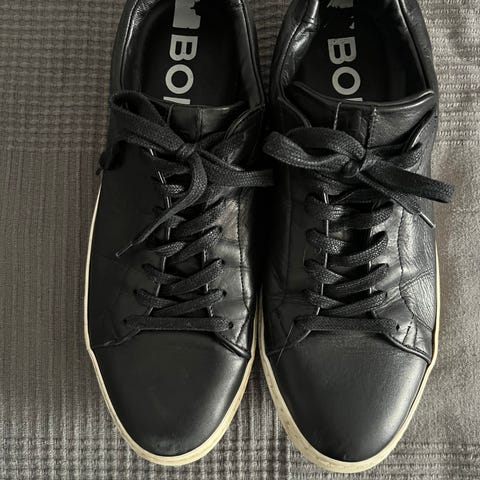 Ett par blå sneakers från MUZZO. Skorna har snörning och en vit sula. Inuti har skorna ett rutigt mönster.