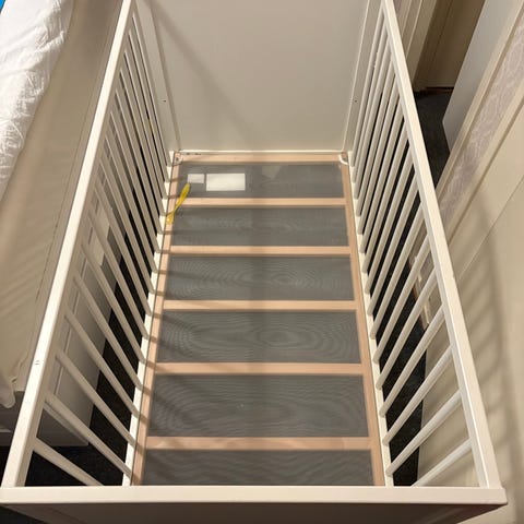 I pris ingår madrass, hjul i separat påse, två dra-på-lakan.