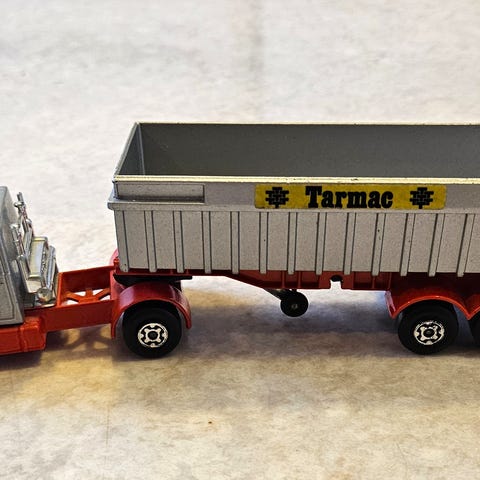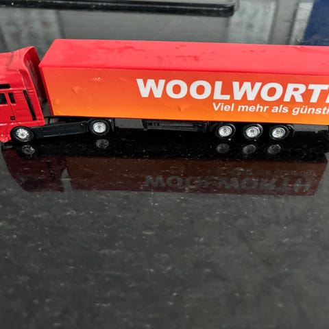 Courtney Trailer modell i plast. Blå färg med detaljer i svart och vitt. Längd cirka 30 cm. Används som modellfordon eller samlarobjekt.