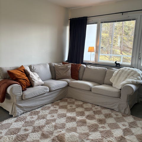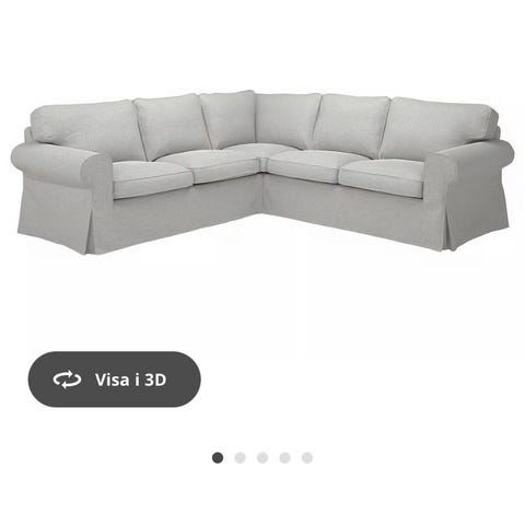 Bra skick, Ektorps hörnsoffa knappt använd. Inga fläckar, Fåtölj och fotpall med förvaring. Klödsel vit.