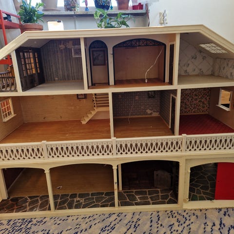Lundby dockskåp i tre våningar, fullt möblerat. Möbler i varierat skick.