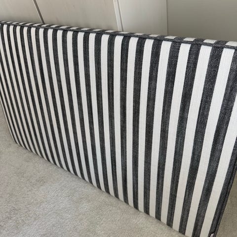 Sänggaveln är en stoppad och pikerad sänggavel från Mille Notti. Gaveln är klädd i ett ljust grått canvastyg och ett medföljande extraskydd i offwhite linne medföljer.