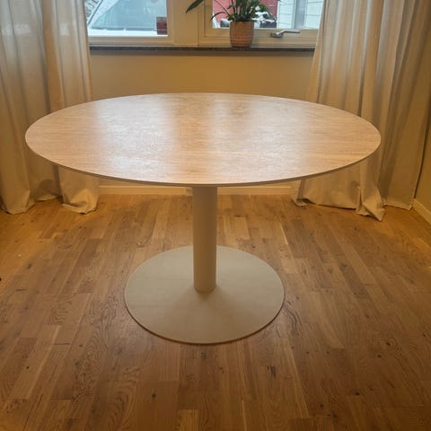 Stilrent matbord i ek och vit bordskiva från Jysk. 120 cm i längd, passar med 4 stolar.