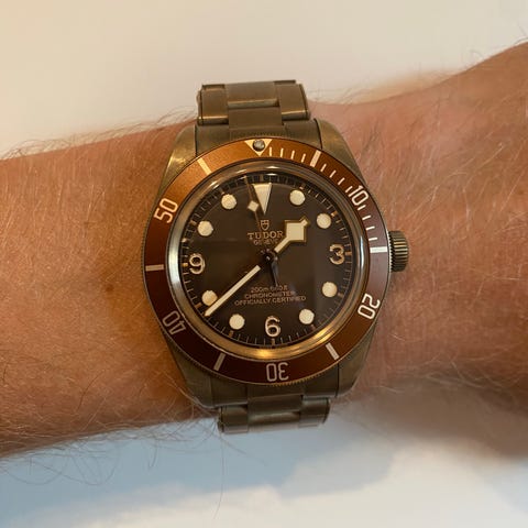 Tudor Black Bay herrklocka i stål. Klockan har en svart och röd bezel, och en stållänk. Designad för män.