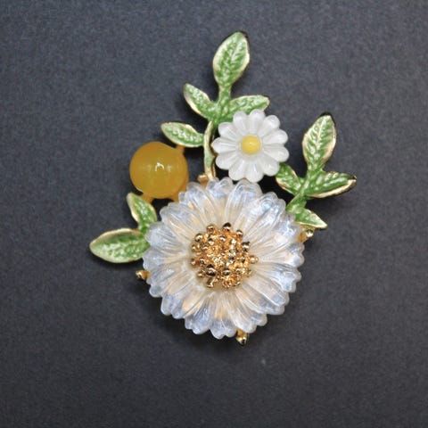 Brosch i form av en blomma med guldfärgad metallram och vita emaljdetaljer. Har en pärlliknande dekoration i mitten. Passar som accessoar för olika plagg.