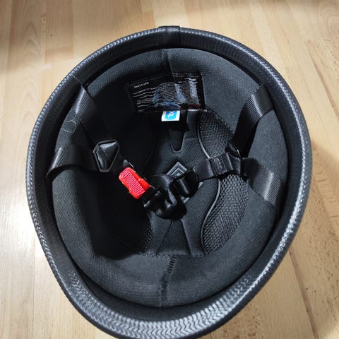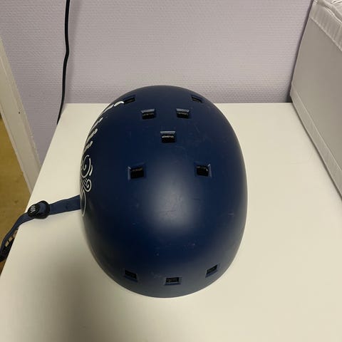 Svart hjälm med flera ventilationshål för luftcirkulation. Hjälmen har ett justerbart spänne för säker passform och är avsedd att skydda huvudet vid olika aktiviteter. Ytan visar viss användning med mindre repor.
