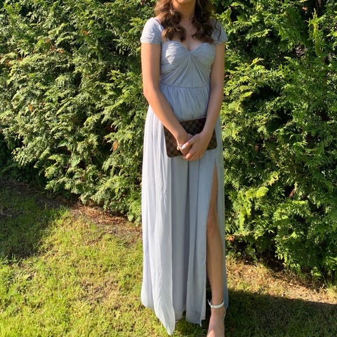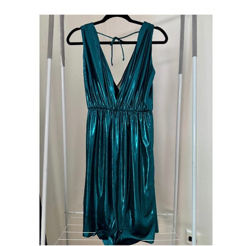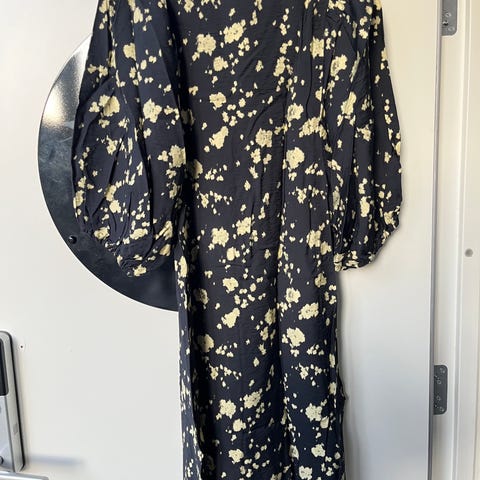 Svart klänning med v-ringning och draperad detalj framtill. Klänningen har korta, vida ärmar och en figurnära passform. Använts fåtal gånger. Nypris. 649kr.
