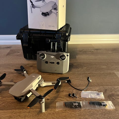 DJI mini 4K drönare, 2 batterier, hand kontroll, väska och tillbehör. Laddare ingår. Bara väskan kostade 600kr. Har haft drönaren i lite mer en ett halvår, kört den några gånger inte så ofta.