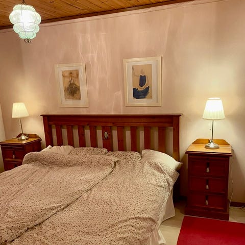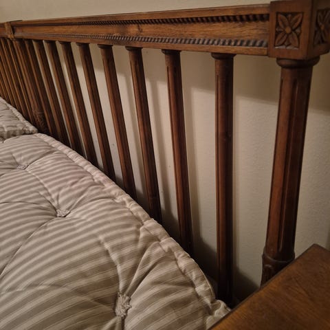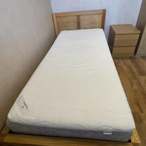 Träsäng (ek) med sänggavel och nattduksbord i trä