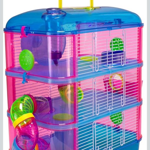 Bur för smådjur med flera nivåer och trappor i trä. Inkluderar allt på bild, mat, en liten plastbur för transport eller isolering, en löphjul i plast och en träleksak med håligheter. Burens design ger möjlighet till klättring och lek för smådjur.