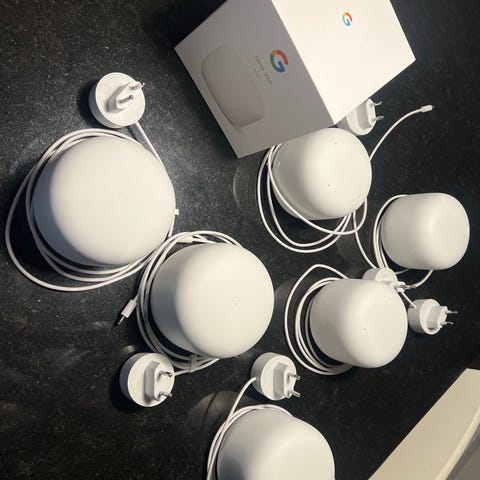 Google Nest WiFi router med två extra WiFi-punkter som även fungerar som smarta högtalare! Trådlöst nätverk med räckvidd över hela huset! Med Google Nest WiFi får du snabb och stabil WiFi-anslutning till alla dina enheter i hela hemmet. Google Wifi är en trådlös lösning för hemmet som används tillsammans med modemet och internetleverantören så att du kan streama, ladda ned och dela utan avbrott. Fungerar bra, men jag säljer p.g.a. att jag vill koppla ihop AP'n via Ethernet för att få bättre kapacitet + behöver ett meshnät med fler än 1 vanligt + 1 gäst-WiFi nät.