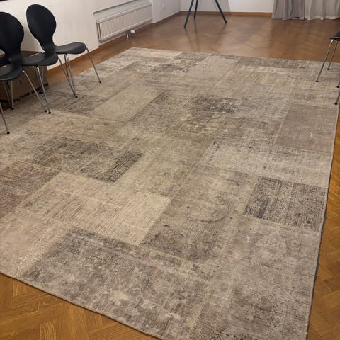 En stor, fin och neutral matta i svart/grå toner.