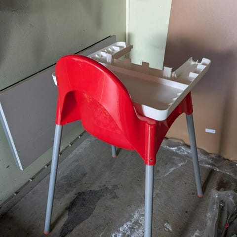 IKEA barnstol med avtagbar bricka och röd-vit-blå dyna