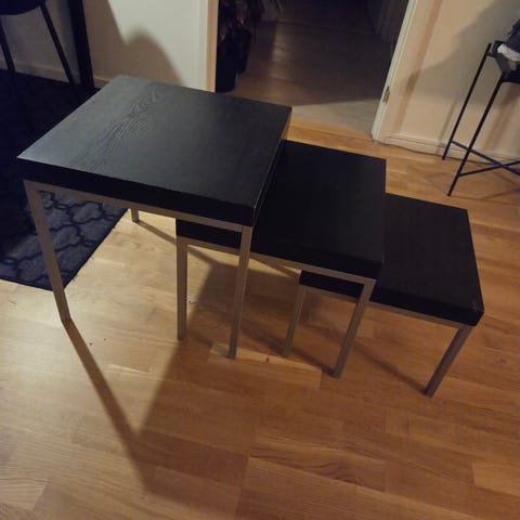 Soffbord i svartlackerad metall från Jysk, säljs inte längre i butik. Nypris 1000 kr. Finns litet märke, se bild.