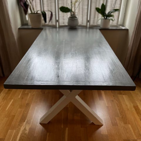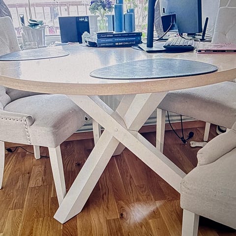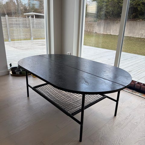 Stort runt soffbord somras väldigt rustikt det väger en hel del bordet är i jättebra skick bara en flisa på ena benet som gått av. Bordet finns på 3e våningen utan hiss är bra om man är stark eller flera att bära bordet. Men det är inget som påverkar användaren av bordet att flisan är borta.