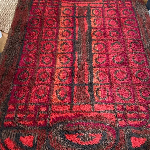 Gosig ryamatta i ull från 60 talet. Fin neutral färg som gör den lättplacerad. Liten ljus fläck som jag inte har behandlat. Längre lugg i mitten då man inte gått där lika mycket som runt kanterna. Inget som stör tycker jag.