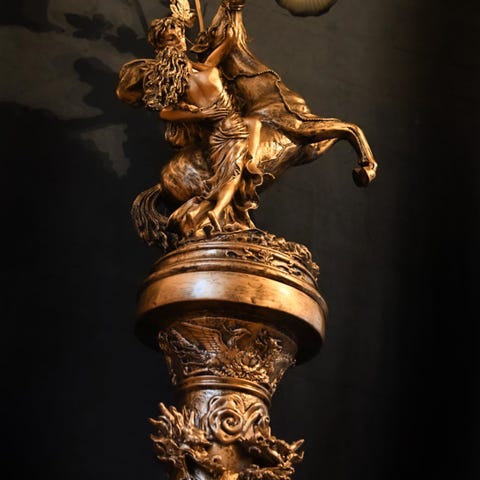 En unik golv lampa med detaljerade vikingamotiv. Lampan har en distinkt design som ger en speciell atmosfär till rummet. Perfekt för dig som uppskattar nordisk historia och karaktärsfull inredning.