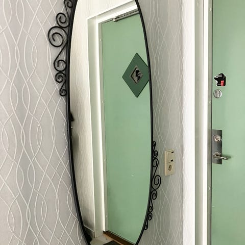 Stor rund spegel från SMD Design i modell Haga. Spegeln är 80cm i diameter med förvaring i nederkant, typ en korg. Ram och korg i vit pulverlackerad metall.