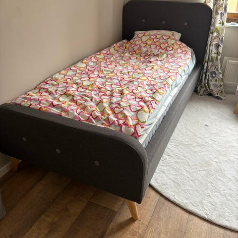 Sängramen är från Jysk och madrassen från IKEA.