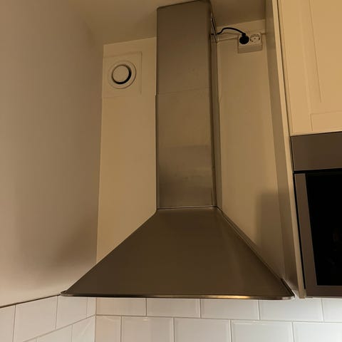 Ikea Köksfläkt i rostfritt stål med glasdetalj. Designad för väggmontering ovanför spis eller häll. Utrustad med knappar för styrning av fläkt och belysning. Passar för användning i kök för att avlägsna matos och ånga.