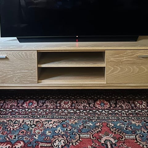 En stilren bänk med förvaring i två lådor och två skåp med glasdörrar.
