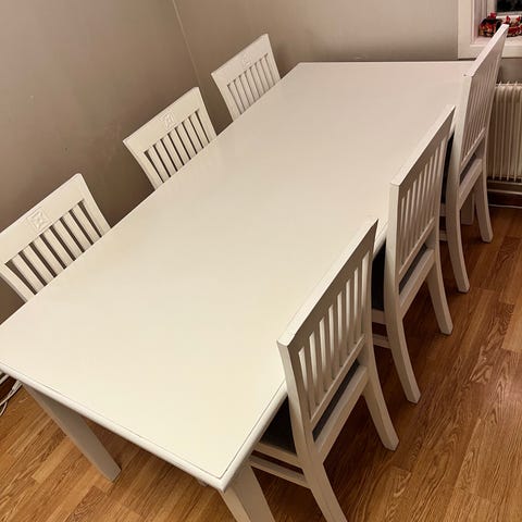Matbord Norden 220 cm + iläggsskiva 45 cm. Bredd 100 cm. Grundpriset innehåller 6 stolar Henriksdal med överdrag. Finns ytterligare 8 stolar med flera överdrag att köpa till för 150:-/st. Vi har suttit 14 vid typ jul. Bordet är i massivt trä o kan slipas. Vi har inte gjort det. Bordet finns utanför Linghem. Ingen hemleverans.