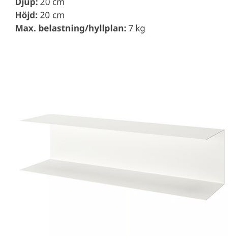 Stilren populär hylla från Ikea. Monteras enkelt och osynligt med en skena baktill som hyllan hängs fast på. Stabil, snyggt att ha två bredvid varann eller ovanpå. Metall. Nypris 299 kr styck. Du får båda för 200 kr.