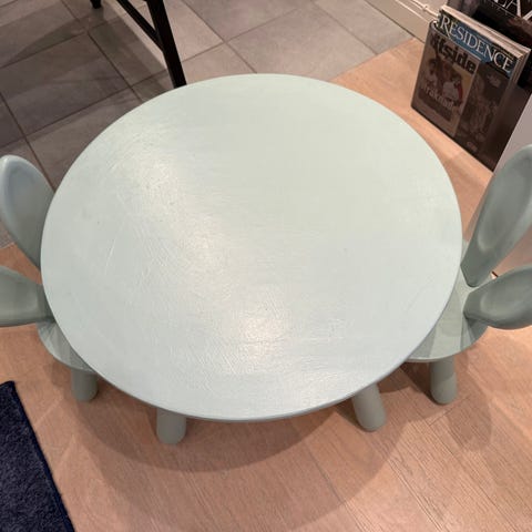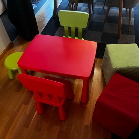Barnmöbelset med blått bord och stolar samt gröna pallar