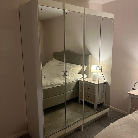 KOMPLEMENT i 100 garderoben: klädstång, hyllplan, 2st lådor, 2st meshbackar. I 50 garderoben: klädstång, glashyllplan, utdragbart hyllplan med insats, 3st lådor med glasfront, 1st meshback.