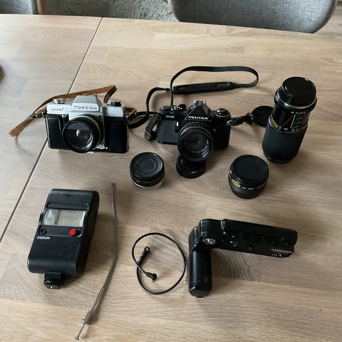 Pentax analog systemkamera med manuell exponering och utbytbar lins. Kamerahus i metall och plast med mekanisk slutare. Passar för filmfotografering och analog bildframkallning. Säljs inkl kameraväska.