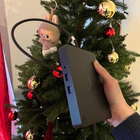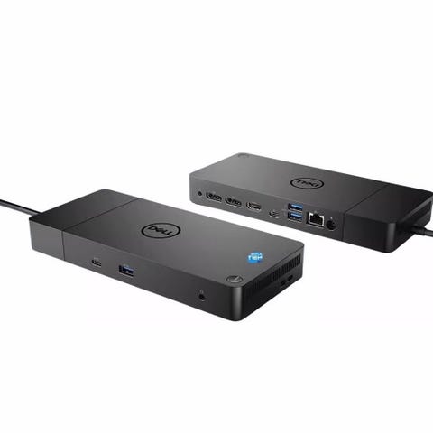 Dell Dockningsstation WD19TBS med flera portar inklusive USB och nätverksanslutning. Enheten har en svart färg och inkluderar strömadapter och anslutningskablar.