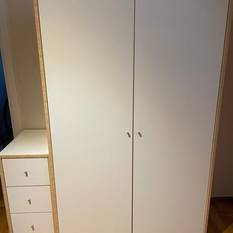 Ikea garderob med vit yta, utrustad med 2 klädstänger men kan givetvis ändras till hyller eller annan av Ikeas inredning efter behov. Garderoben är anpassad för förvaring av kläder och har mått som visas på bild med tumstock. Passar för olika typer av klädförvaring i hemmet.
