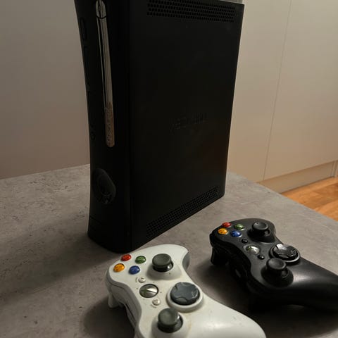 Xbox 360 spelkonsol inklusive 1 kontroller (1 PS-kontroll syns på bilden. Ingår ej) och tre spel. Konsolen är svart och levereras med strömadapter och anslutningskablar. Extern hårddisk med spel på ingår (okänt antal spel).