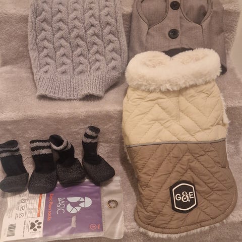 Det finns en hel del grejer som syns på bild men även kläder, bädd, bilstol, hängväska/ väska och flygväska då vår valp har vuxit ur dessa