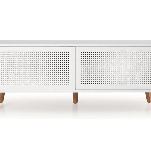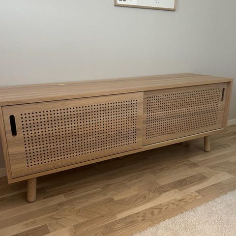 Skandinavisk formgivning med naturliga material och en lyxig känsla. Färg: Ek/vit. Mått: Längd 180, Höjd 55, Djup 43 cm. Den har två skjutdörrar med dekorativa, praktiska hål och två justerbara hyllplan för att kunna anpassa efter behov. Mediabänken har två hål på baksidan för sladdar och kablar man inte vill se. Nypris: 7990 kr, säljs för 2900 kr.