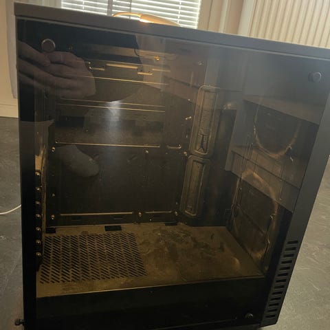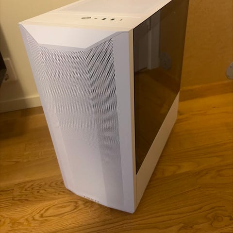 Datorchassi i svart färg med transparent sidopanel. Chassit är utformat för att rymma standardkomponenter för stationära datorer och har flera expansionsplatser och ventilationsöppningar för effektiv kylning.