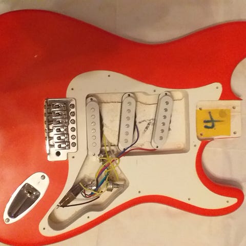 Plektrumskydd och backplate, 3-lagers (3-ply) mintgrön för stratocaster med 8 skruvhål, vilket verkar vara en ovanlig kombination. I fint men använt skick, se bilder. Bakplattan har lite bältesskrap.
