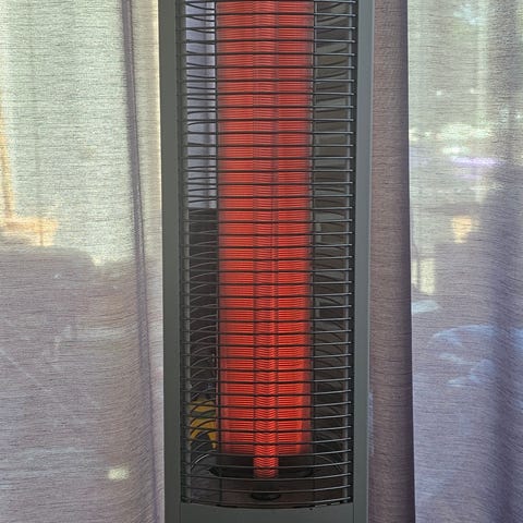 Takmonterad infravärmare med svart färg. Utrustad med upphängningskrok och dragkedja för enkel användning. Passar för uppvärmning av mindre områden.