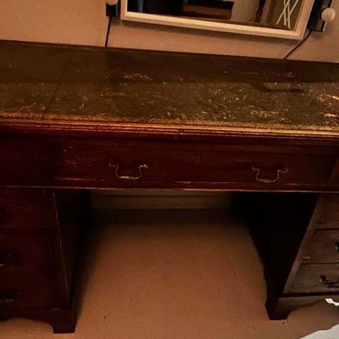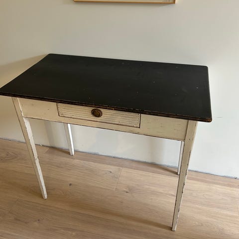 Skrivbordet är av äldre modell och har lite skav och skavanker.