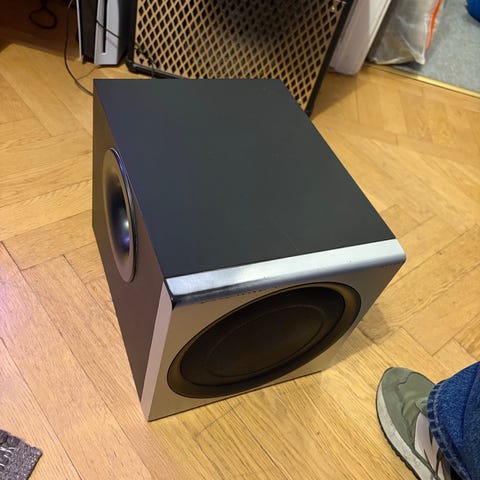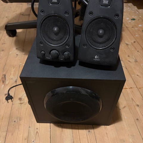 Logitech Z-2300 högtalarsystem med subwoofer och satellithögtalare. Systemet är utformat för att leverera ljud med djup bas och klar diskant, lämpligt för hemmabio och musiklyssning.