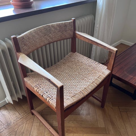 Säljer denna äldre rejäla trästol. Tror den är i ek.