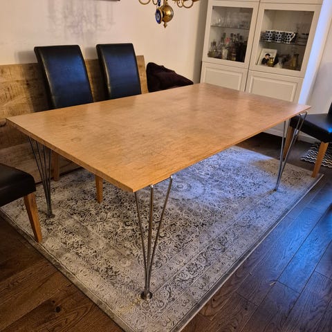 Bordet är helt stabilt men ytskiktet i bordsskivan är lite hårt åtgånget från några år med småbarn vid matbordet. Repor, små nedsänkning osv i lacken. Syns inte på håll men om man tittar nära så är det fullt synligt, se bilder. Passar perfekt om man vill ha ett snyggt matbord utan att behöva vara så rädd om ytan, eller för den som vill rusta upp skivan. Ena kortsidan har en lagning, se bild.