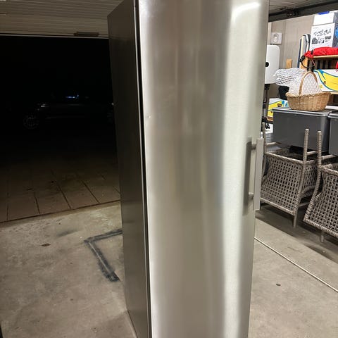 Gram kylskåp i rostfritt stål. Utrustad med flera hyllplan och dörrfack för förvaring. Passar för hushållsbruk.