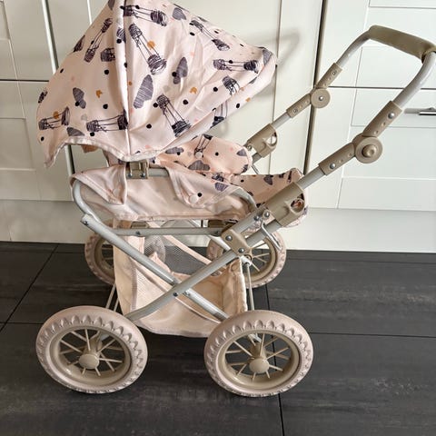 Skrållan dockvagn, ligg- och sittdel samt löstagbar liggdel. Justerbart handtag så det passar många längder och åldrar.