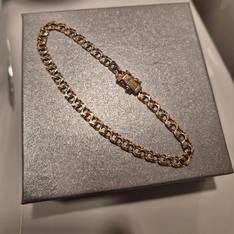 Förvaras i bankfack, så kontakta mig i god tid vid intresse så jag hinner ta ut armbandet inför affär.