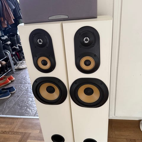 Begagnade golvhögtalare i gott skick. Bestyckade med dubbla 8 tums baselement, 5 tums mellanregister samt 1 tums softdome diskant. Högtalarna är inköpta på Reference Audio på Götgatan i Stockholm i mitten av 90-talet. Fäste för högtalarkabel: kläm, spade eller banankontakt.