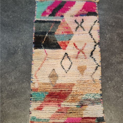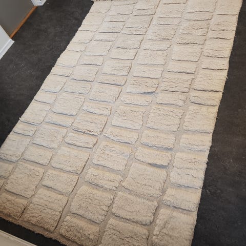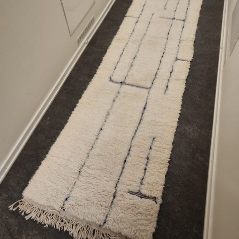 Skapa en varm och stilren känsla i ditt hem med en handknuten Beni Ourain-matta, tillverkad av naturlig, obehandlad ull av berberkvinnor i Atlasbergen.