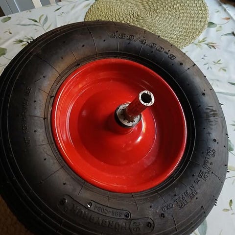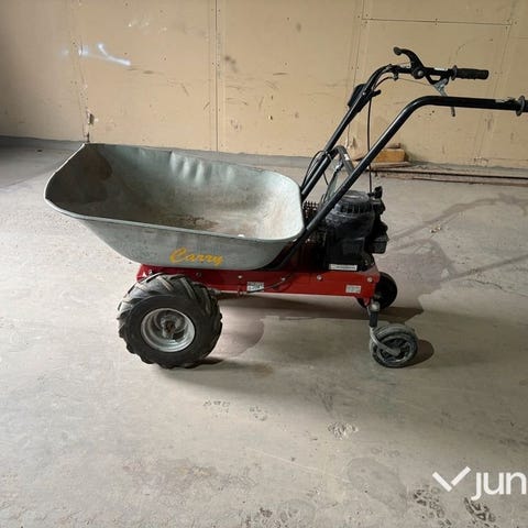 Skottkärra med galvaniserad metallbalja och svart ram. Utrustad med ett hjul och två handtag för manuell användning. Passar för trädgårds- och byggarbete där transport av material krävs.