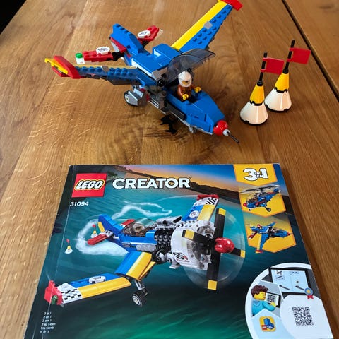 LEGO Creator 31079 flygplan byggsats med 3-i-1 funktion, inklusive delar för att bygga olika modeller. Setet är i färgerna rött, blått och vitt, och innehåller en minifigur. Byggsatsen är avsedd för kreativ lek och konstruktion.